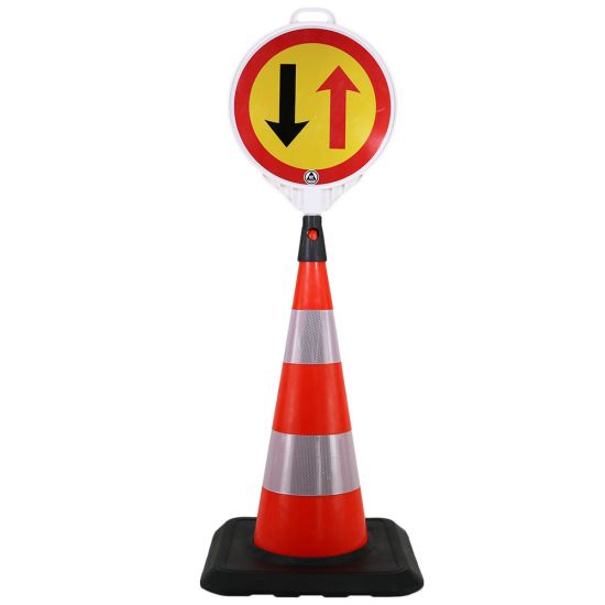 Kit format din un con rutier cu inaltime de 750 mm si un indicator din plastic de prioritate pentru circulatia din sens invers.