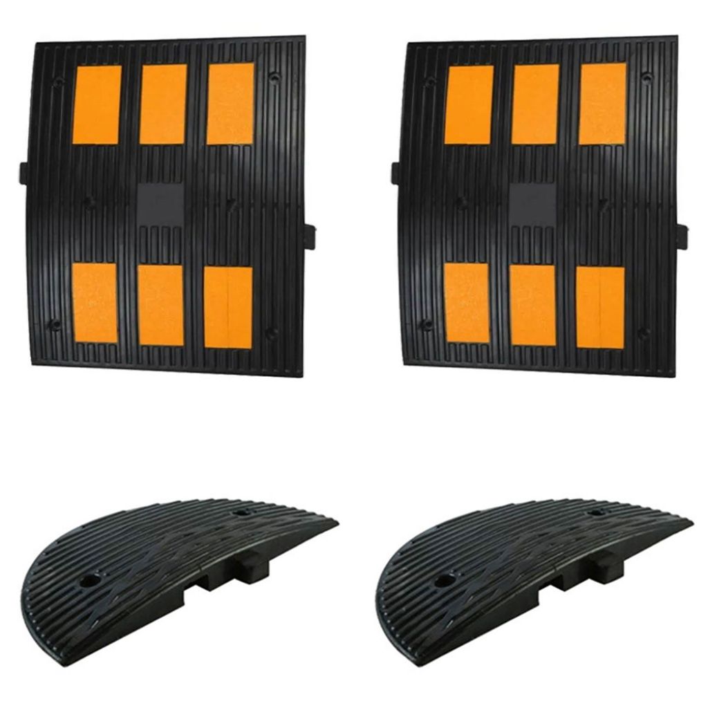 Set limitator de viteza din cauciuc cu pelicule reflectorizante galbene pentru strada de 2 metri compus din 2 limitatoare de viteza, dimensiune 600x500x45 mm, si 2 capace de limitator de viteza, dimensiune 600x300x45 mm, pentru un total de 1.6 metri.