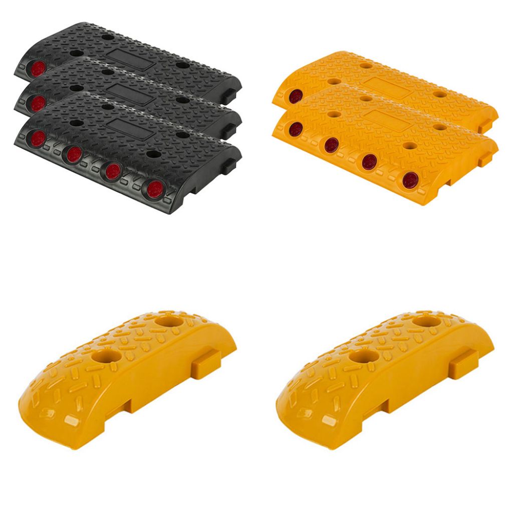 Set limitator de viteza din plastic cu catadioptrii pentru strada de 2 metri compus din 5 limitatoare de viteza, culori negru si galben, dimensiune 250x350x50 mm, si 2 capace de limitator de viteza, dimensiune 250x100x50 mm, pentru un total de 1.95 metri.