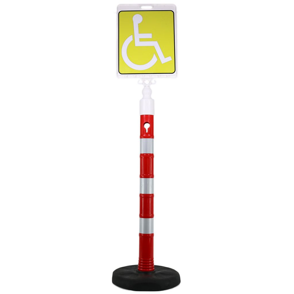 Set format din un stalp cu inaltimea de 1100 mm, o baza cu greutatea de 6.5 kg si un indicator din plastic pentru locuri de parcare rezervate persoanelor cu handicap.